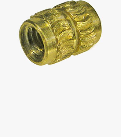 Navojni umetci za vruće ili ultrazvučno umetanje bez glave, oblik S nazubljenih/zaobljenih nazubljenih izbočina, za termoplaste Mjed – obična